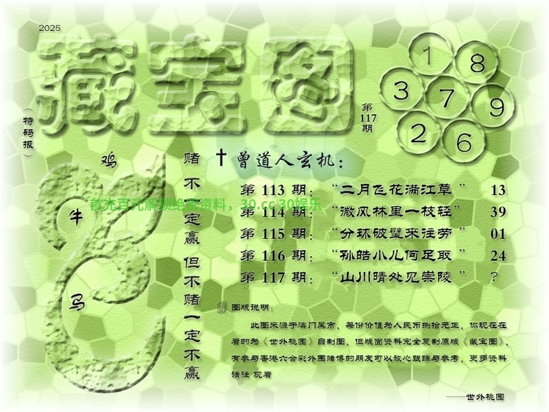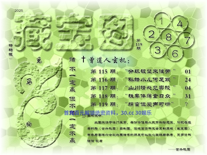 120期藏寶圖新:荒园茅塞闭墙隈 老:自古骄兵多致败 禁:狗 禁:9尾 玄機字:《堂》